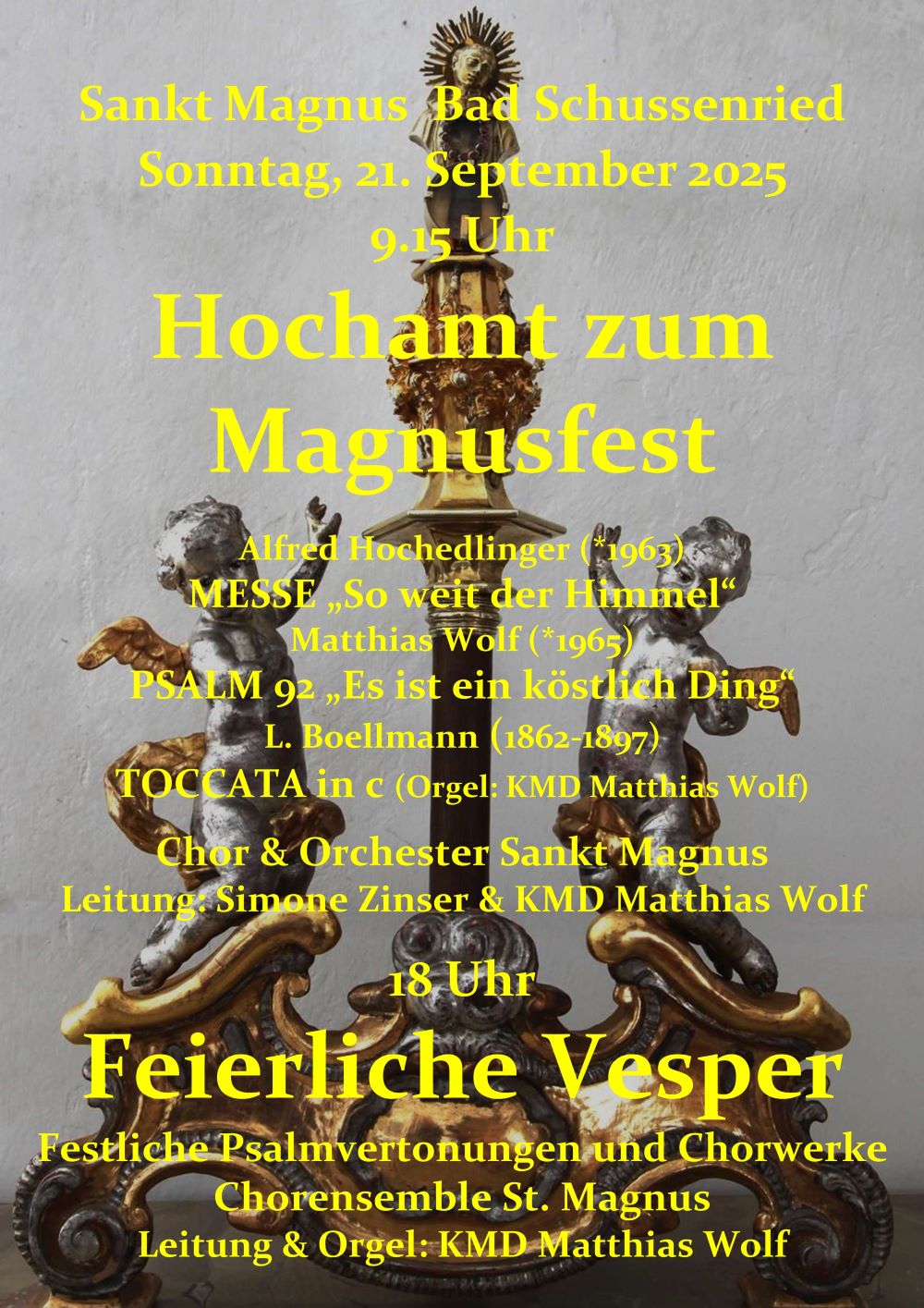 Eine weitere Möglichkeit unseren Kirchen- und Stadtpatron zu ehren, bietet am Magnusfest-Sonntag um 18 Uhr der feierlich-festlich gestaltete Vespergottesdienst, der von einem 4-stimmigen Ensemble des Magnuschores gestaltet wird. Unter Leitung von KMD Wolf werden festliche Psalmvertonungen und Gesängen musiziert sowie das Magnuslied gesungen.